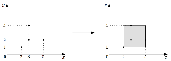 예를 들어 위와 같이 (2, 1), (3, 2), (5, 2), (3, 4) 네 점에서 옥구슬을 발견하였다면, 임씨에게 돌아갈 대지는 (2, 1), (5, 1), (2, 4), (5, 4)를 네 꼭짓점으로 하는 직사각형이며, 넓이는 (5 - 2) × (4 - 1) = 9 가 된다.