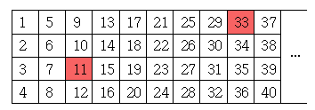 예를 들어 저 숫자판에서 11과 33을 생각했다고 하자. 그렇다면 11과 33사이의 직각거리는 8이 된다.(동서방향거리 : 6, 남북방향거리 : 2) 다음 그림에 잘 나타나있다.