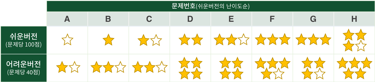 위와 같이 문제를 준비하면 프로그래밍 대회에 익숙하지 않은 사람은 앞에서부터 따라가면서 도전해볼 수 있어 쉬운 문제를 찾는 데 시간을 쓰지 않을 수 있고, 어려운 버전으로 학교 대표 선발을 위한 변별력을 유지할 수 있으며, 모든 문제가 읽히길 바라는 출제진의 소망도 이룰 수 있을 것이다!